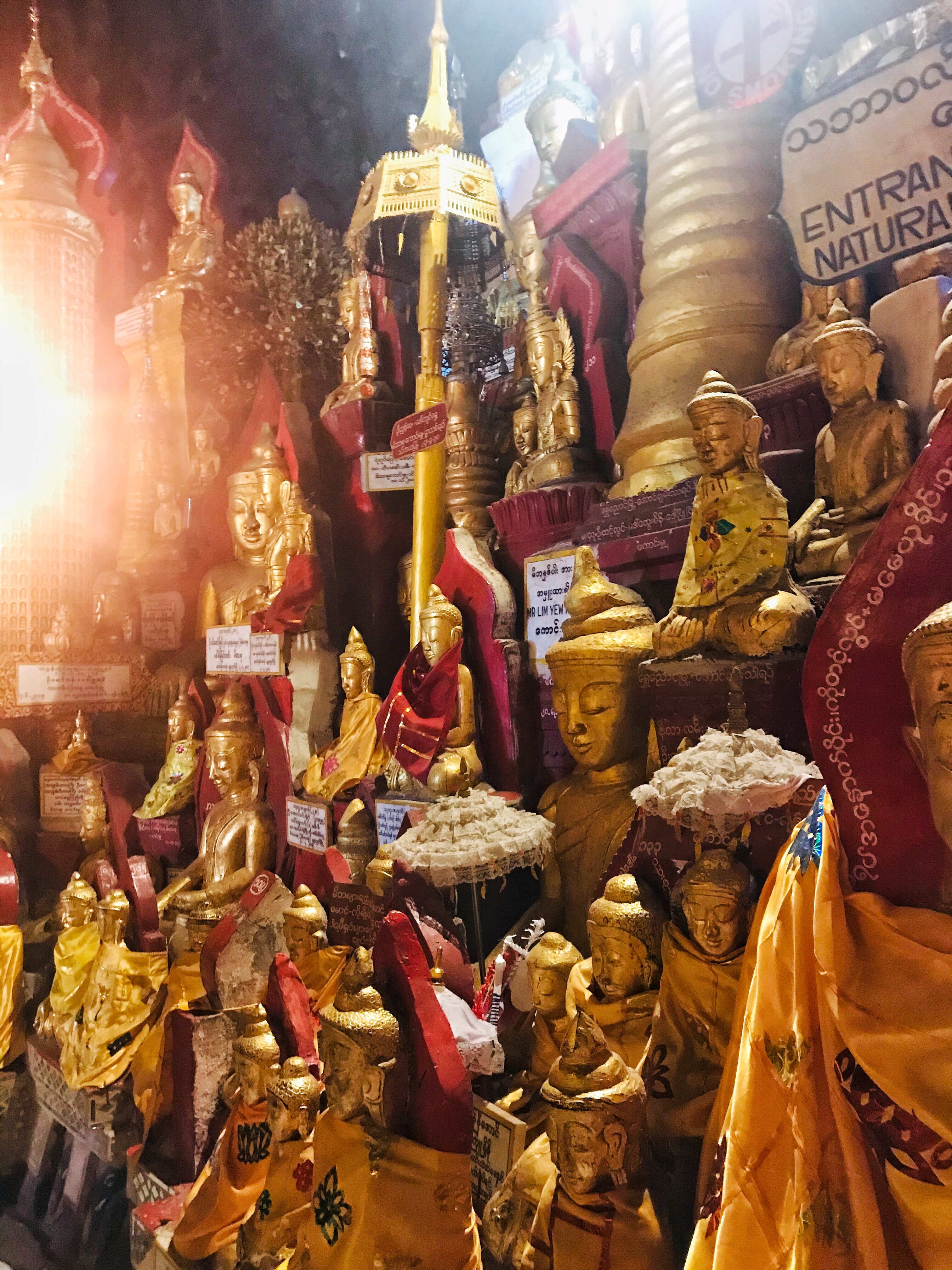 Ancora un giorno a Inle lake così decidiamo di andare in due posti un po’ particolari. Di buon mattino il nostro driver, con una giacca in pelle marrone e il suo elegantissimo longyi nero, viene a prenderci e percorrendo circa due ore di strada dissestata tra i villaggi arriviamo a Pindaya: una caverna con all’interno migliaia di statue di Buddha antiche secoli e altre donate da tutto il mondo (ultimo censimento contava 8000 statue).