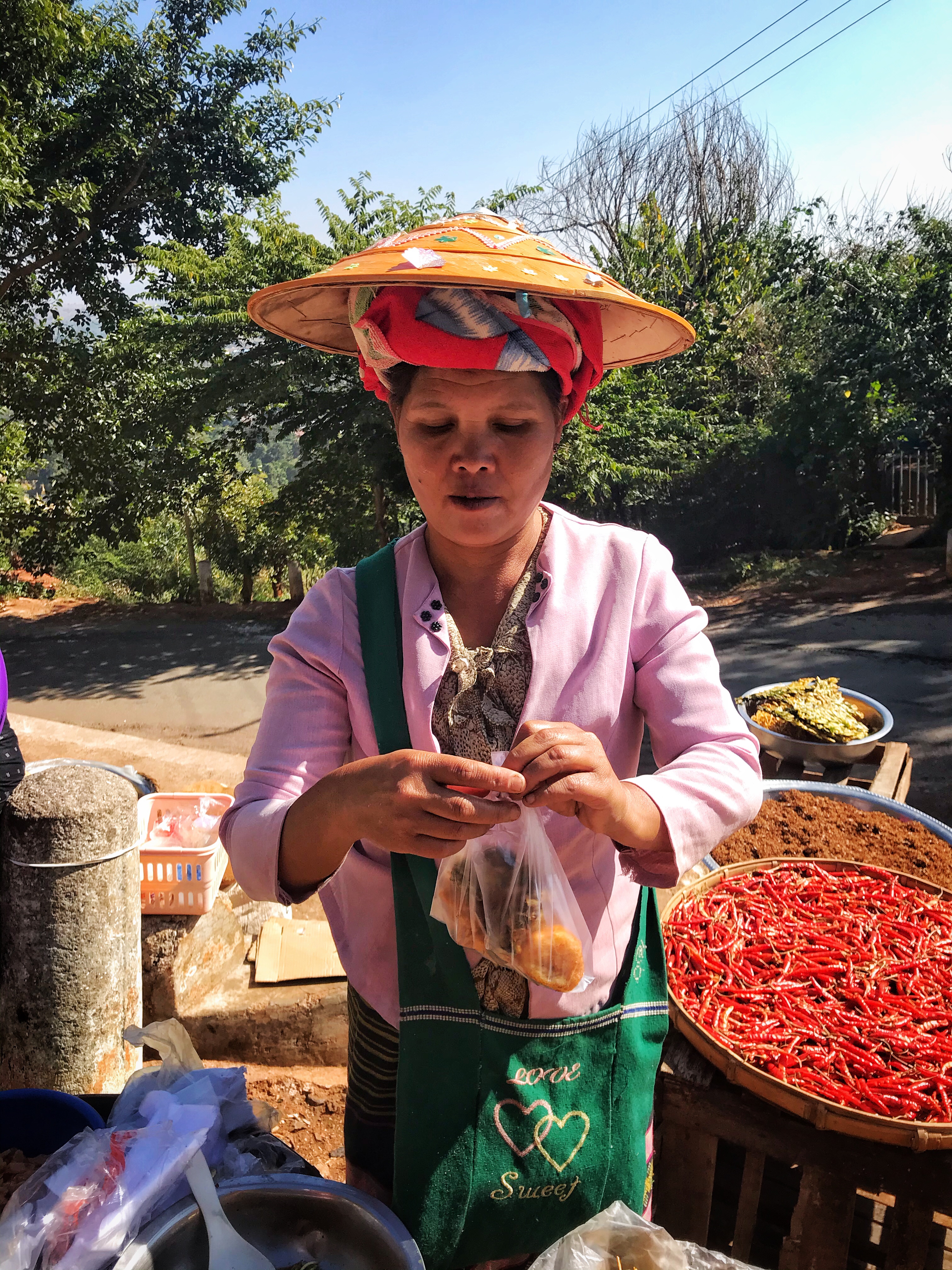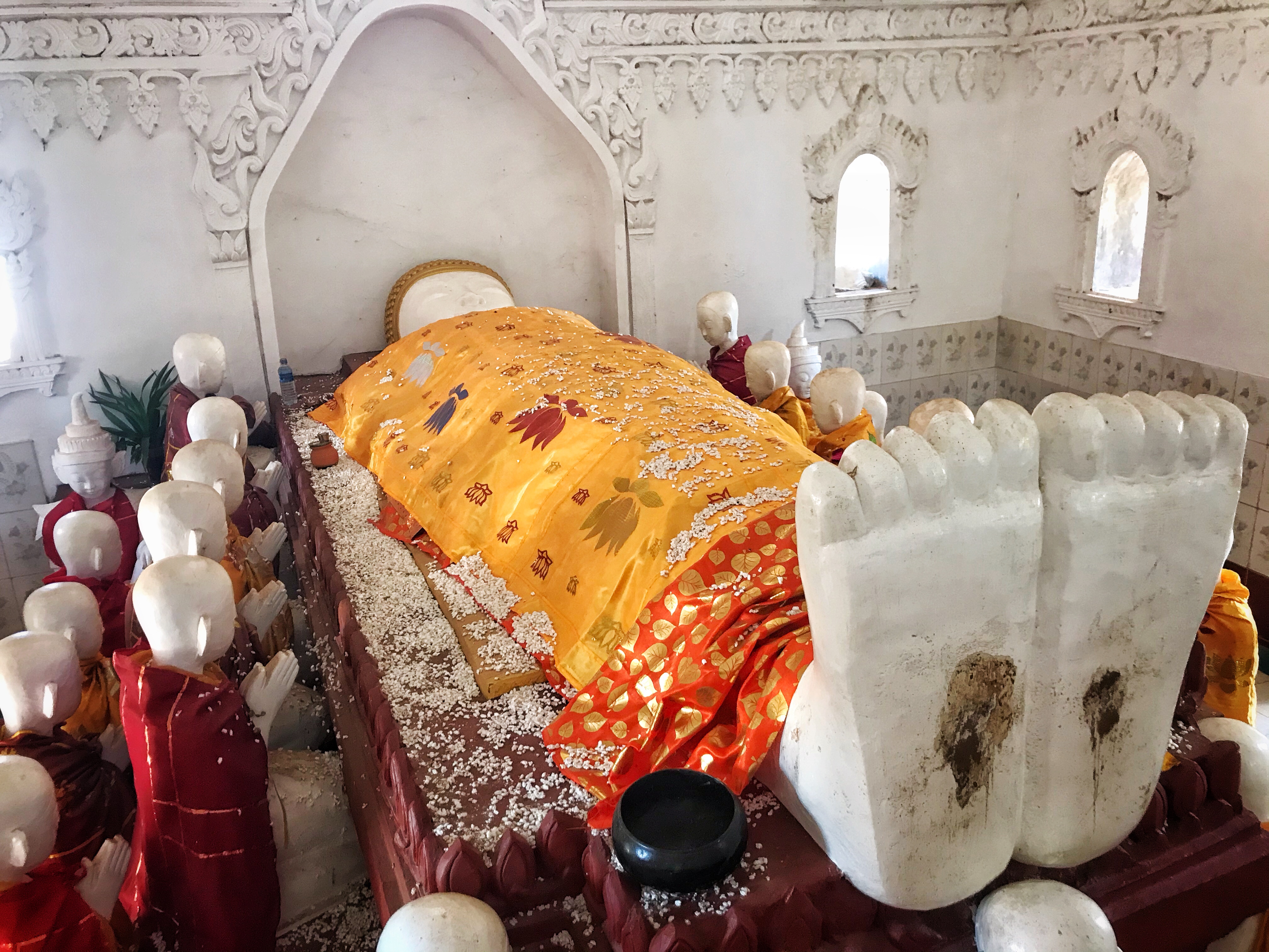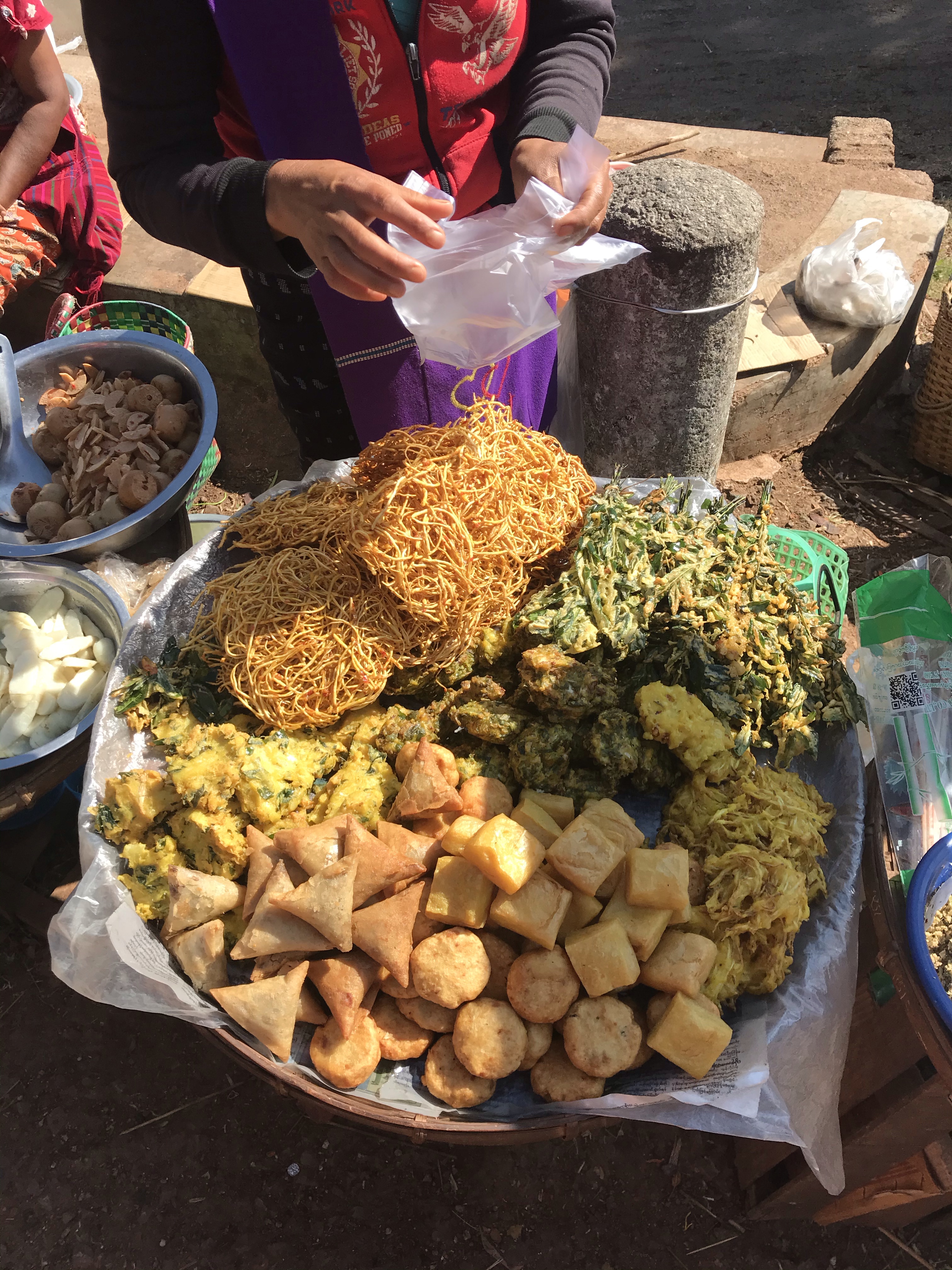Finito il giro usciamo con un leggero languirono e quindi contrattiamo con le signore del finger food birmano per avere qualche samosa e frittella di mais e spinaci! Quanta bontà! Tutto untissimo e frittissimo ma si sa, le cose più buone non fanno tanto bene! Machissenefrega. Il nostro distinto driver ci preleva prima che compriamo tutta la bancarella e ci porta in tre ore in un altro luogo davvero magico.