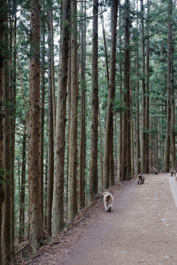 Oggi ci aspettano i macachi che si fanno il bagno nelle sorgenti calde. Ci voglio andare perché non è un’attrazione costruita per i turisti: questi macachi vivono qui da sempre e, da generazioni, hanno imparato a immergersi nelle acque termali naturali per scaldarsi durante l’inverno. Arriviamo all’imbocco del sentiero.È presto, saranno le 8:30 circa. Iniziamo a camminare nel bosco, circondati da questi cipressi altissimi che sembrano guardarci dall’alto, immobili, quasi a controllare tutto quello che succede sotto di loro.